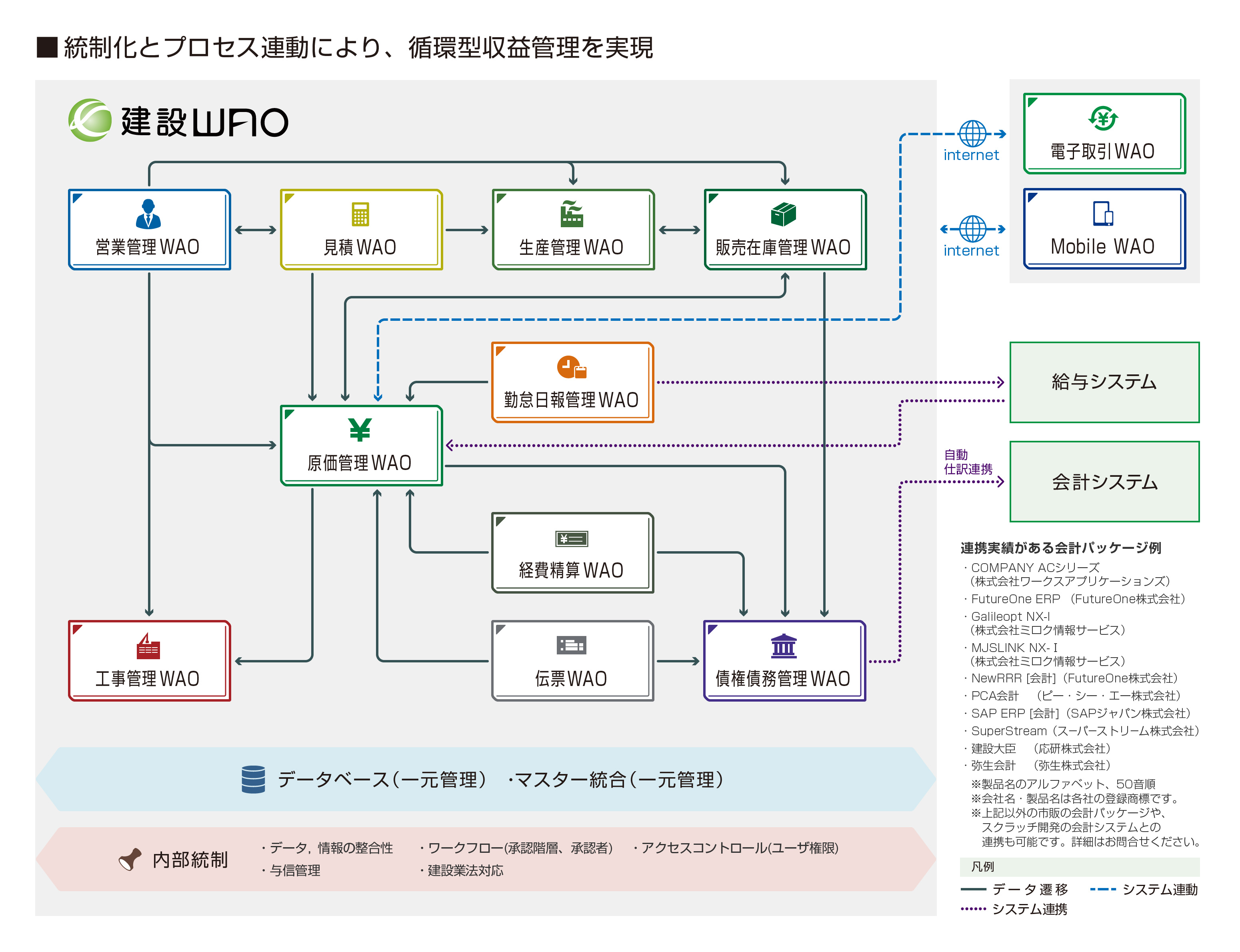 建設WAOは建設業の複数の業務(営業管理、見積、原価管理、工事管理、販売在庫管理、生産管理、経費精算)を同一の設計思想、同一のデータベースで稼働させる建設業向けの統合化システムです。 個別システムごとのデータベースを一元化しシステムを統合化することで、データを入力すると関連するすべてのシステムに即時に反映され、多くのメリットを生み出します。