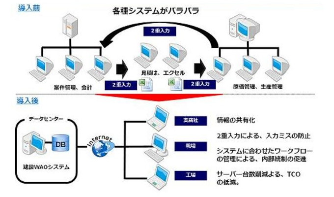 導入前は、案件管理と会計についてはオフコンを利用しており、また、見積についてはExcelとその他オープン系のシステムを利用しておりましたが、建設WAOの導入によってシステムの統合化を実現させ、大幅な業務改善につながりました。重複の手間が解消され、情報の共有化によってビジネス全体が加速したとご評価を頂いております。