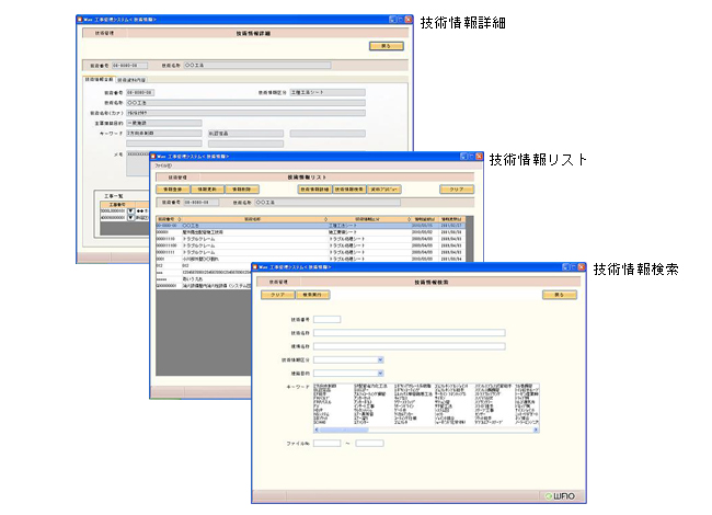 技術情報システムでは、工事案件に関するクレーム・トラブル情報やVE・CDの提案内容などを工事管理WAOの工事情報システム、社員情報システム、協力会社システムに連動させて管理ができます。また必要に応じて電子ファイル化した技術情報を添付することも可能です。