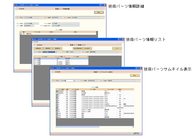 技術及び施工内容の名称、技術区分、主要目的、キーワードなどを主体に登録。施工要領書やトラブル、クレ-ム処理などで使用する写真や図、定型フォ-ムなどをパ-ツとして登録も可能。