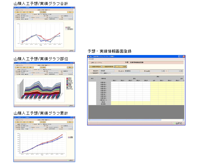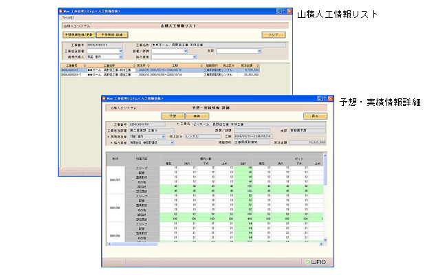 山積人工システムでは、各現場の労務山積人工を部位別に入力DB化し、各現場の月次山積人工の予想と実績差異の管理が可能です。また実績結果は基準データとして利用できるため、様々な建築条件から予想山積人工を算出し概算見積や施工の工程表作成に役立てることができます。
