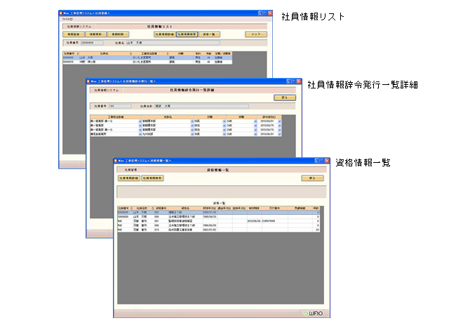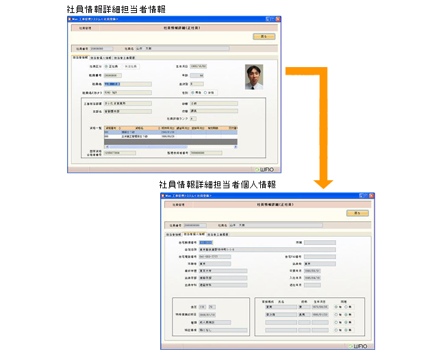 社員情報システムでは、各社員の業務に関係する情報および所属組織変更履歴や資格管理など着工時に必要な情報の他に、その社員が係った工事経歴の情報まで管理できます。また、CORINSで必要な「国家資格合格者番号」や「監理技術者番号」についても対応しています。