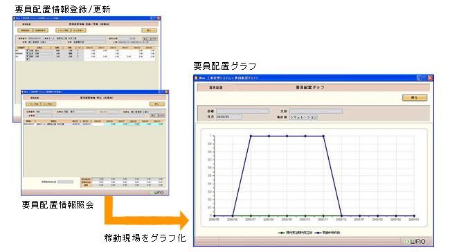 要員配置管理システムでは、各工事案件単位で社員の施工管理レベルによる月毎の消化高の算出が可能です。その値を目標消化高とし、各社員の現場配置をシミュレーションできるシステムです。