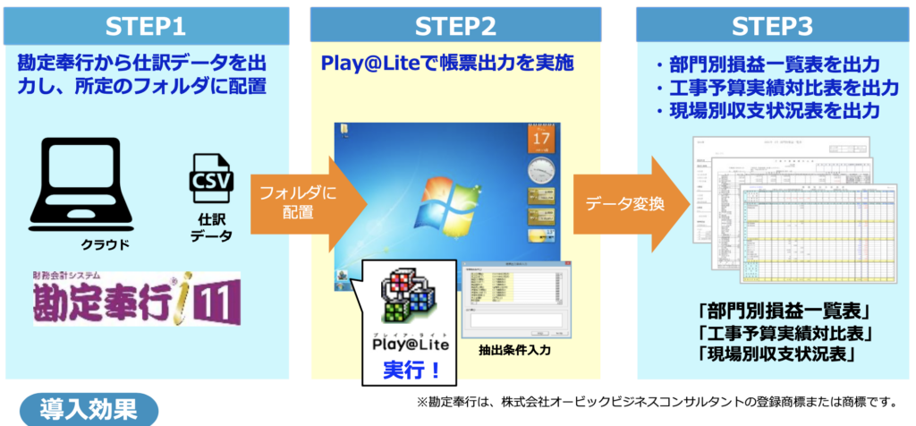 - 建設業向け帳票を出力するために、会計システムから出力されたデータから任意の帳票を自動で作成する。