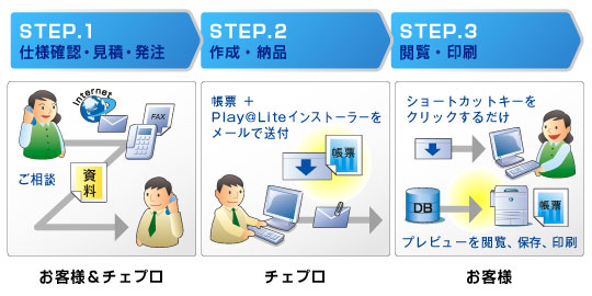 お客様のご仕様に沿ったカスタム帳票作成はチェプロが担当。完成後は、「Play@Liteサービス インストーラー」をメール添付送付で納品。