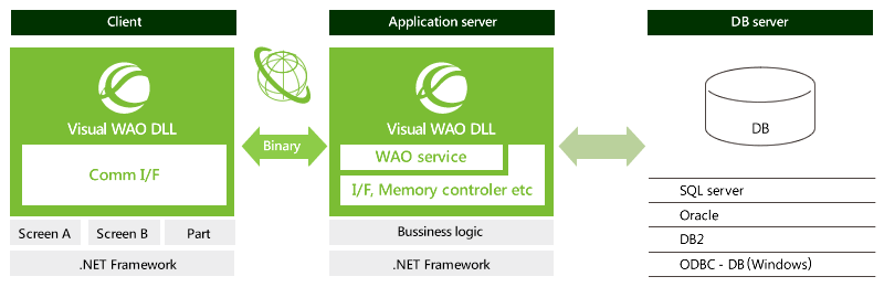 The developer uses Windows Forms in Visual Studio to develop the application by dividing up projects between the client side and the application server side. By placing a Visual WAO DLL in these projects on the client side and on the application server side, and adding a few lines of functions to the coding, it will work in HTTP as a synchronized Web application when executed. The Visual WAO DLLs can be easily and automatically generated using the Visual WAO Development Tool, which is offered free of charge. Connections or events from the client can be received and the processing results can be returned to the client, by means of the WAO Service, which is contained in the Visual WAO DLL placed on the application server side. For this reason, there is no need for Web servers (IIS), which are necessary in ordinary Web systems.